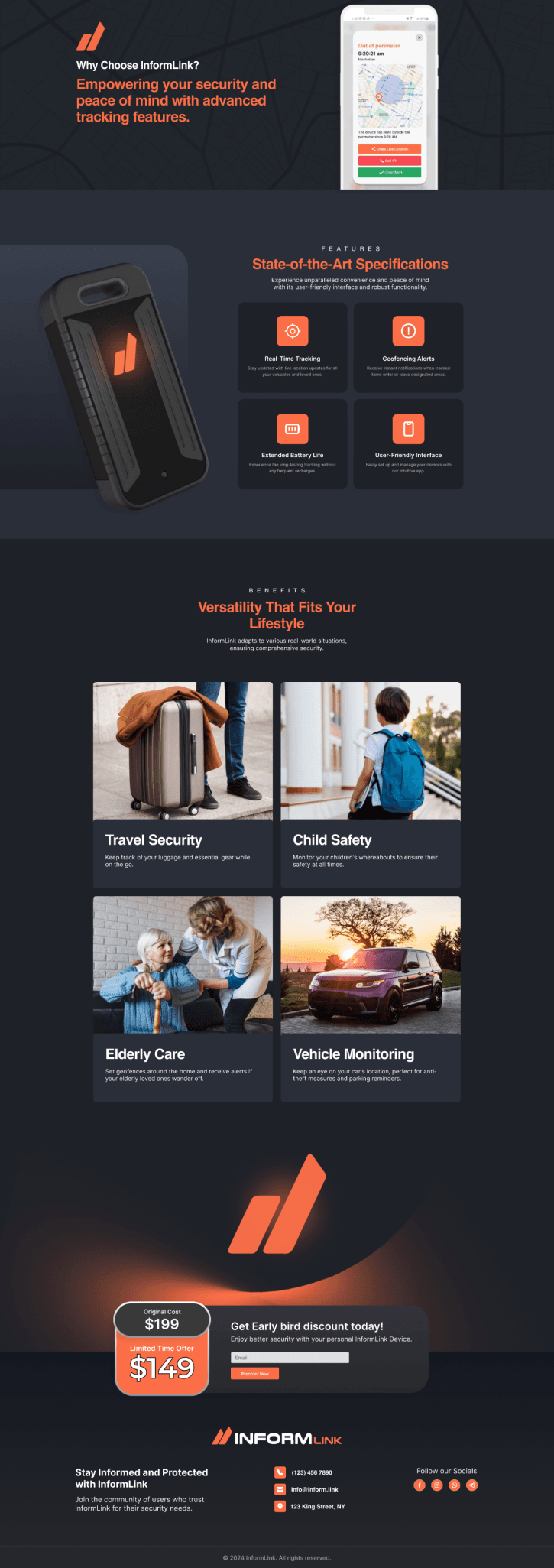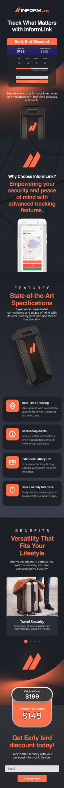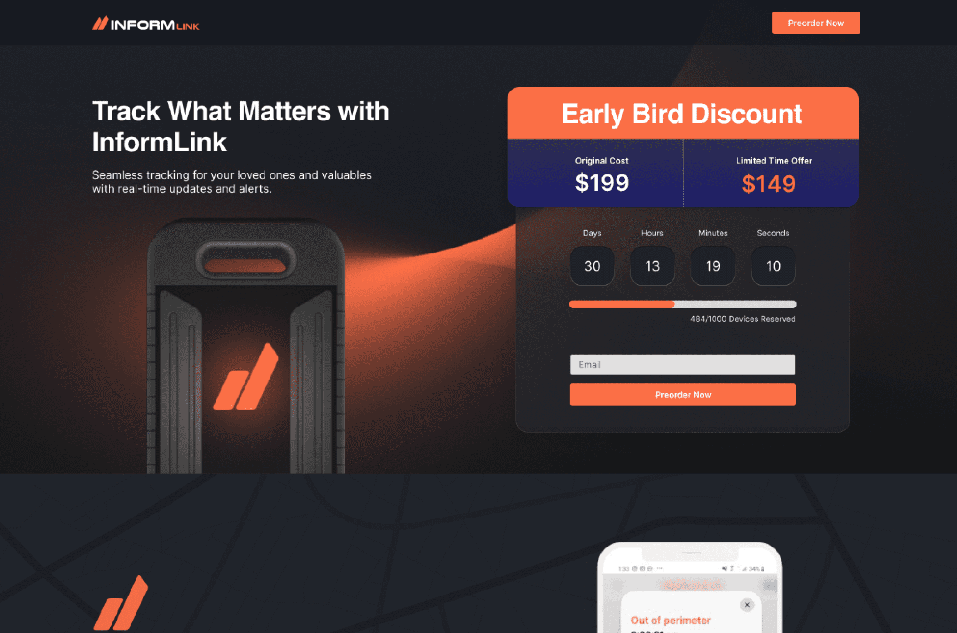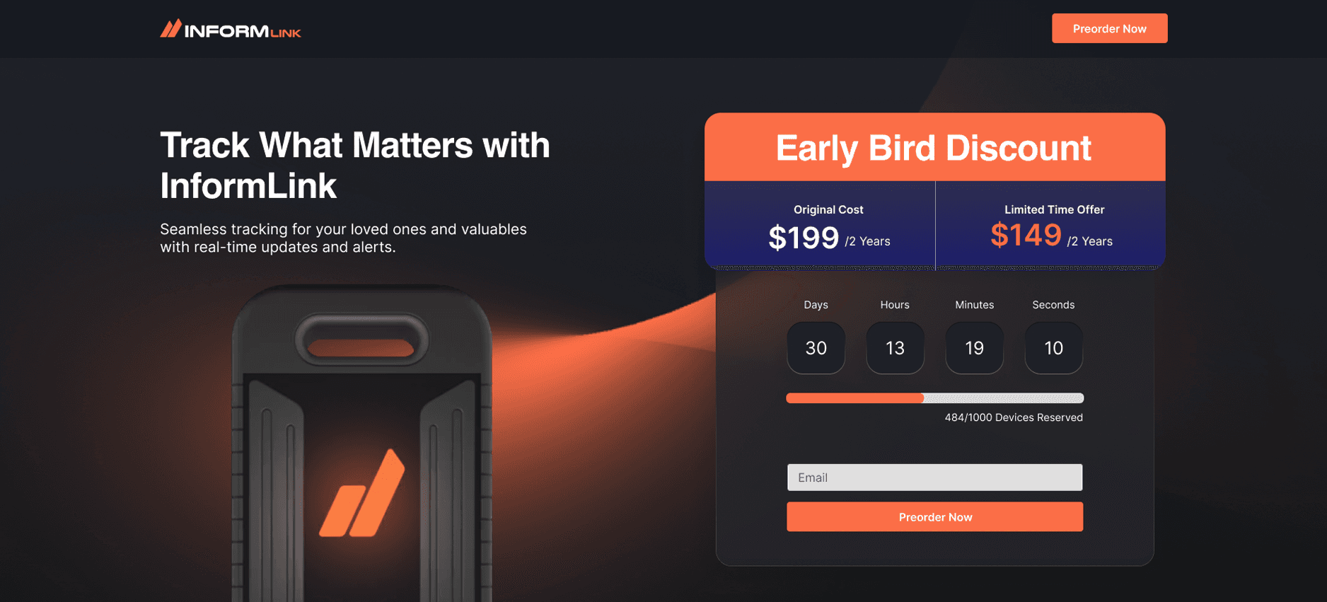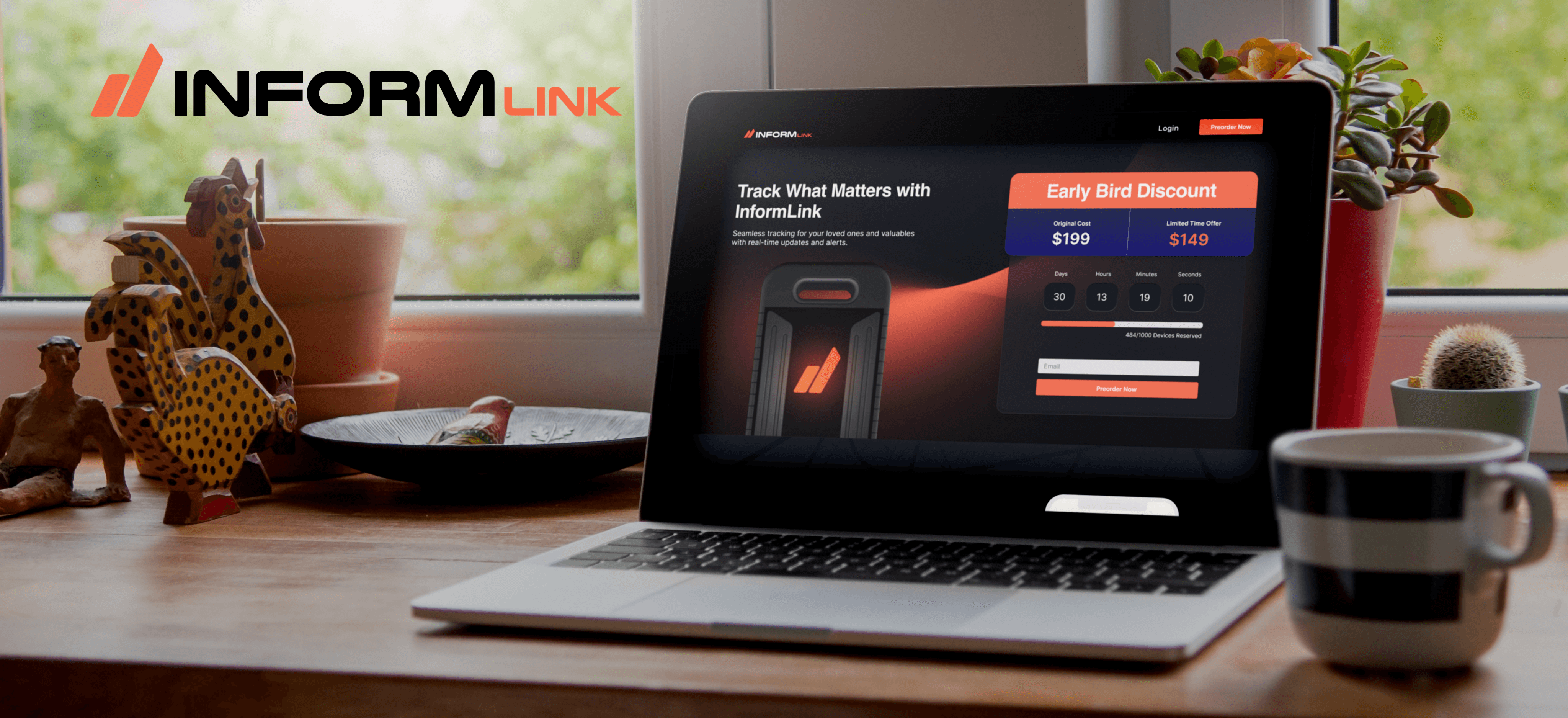 The landing page features a modern and organized design, emphasizing the company's key strengths. At the top, an eye-catching Limited time offer section offering the device for the lower price for a lower time period on a limited number of devices. Below this, brief description of the InformLink device is displayed.
